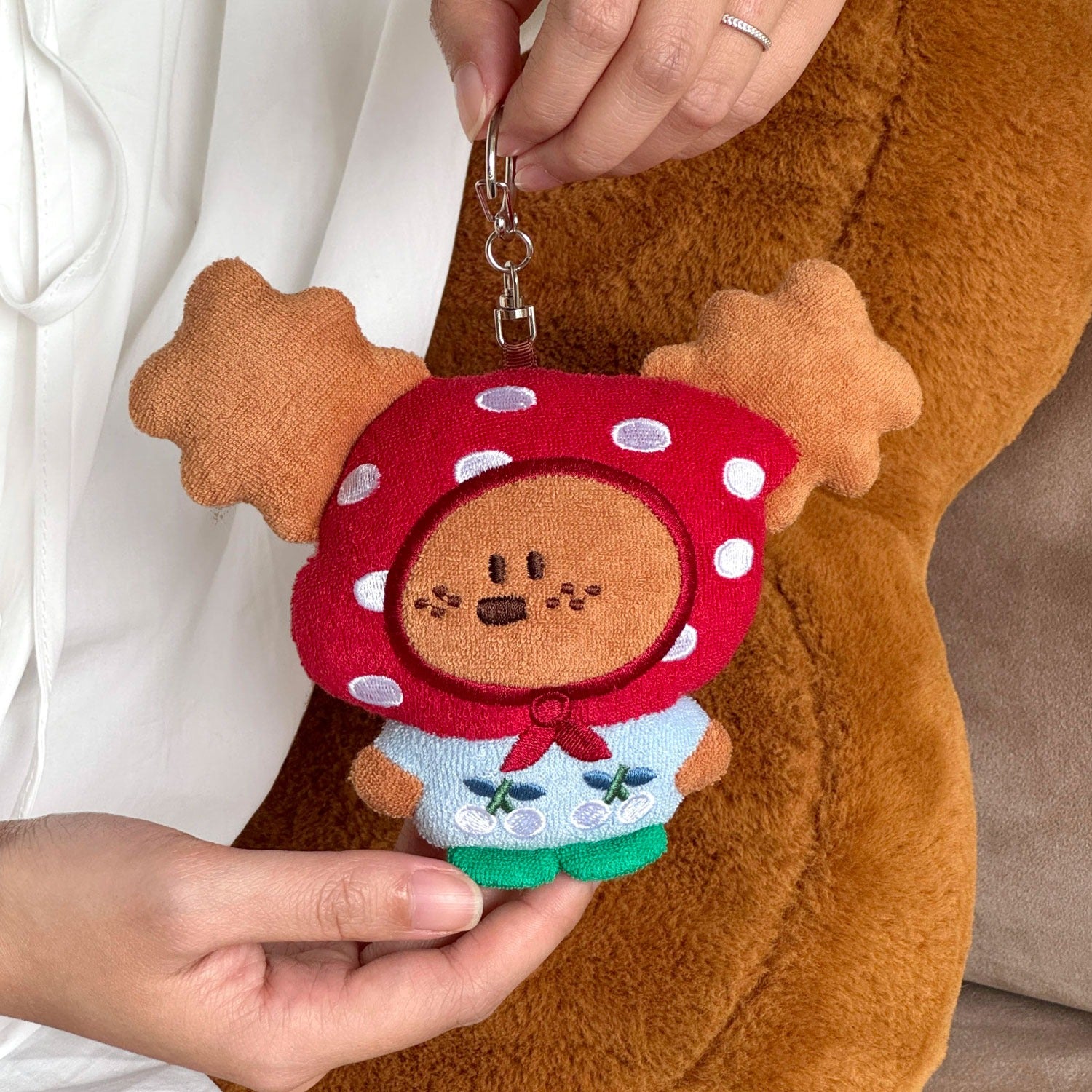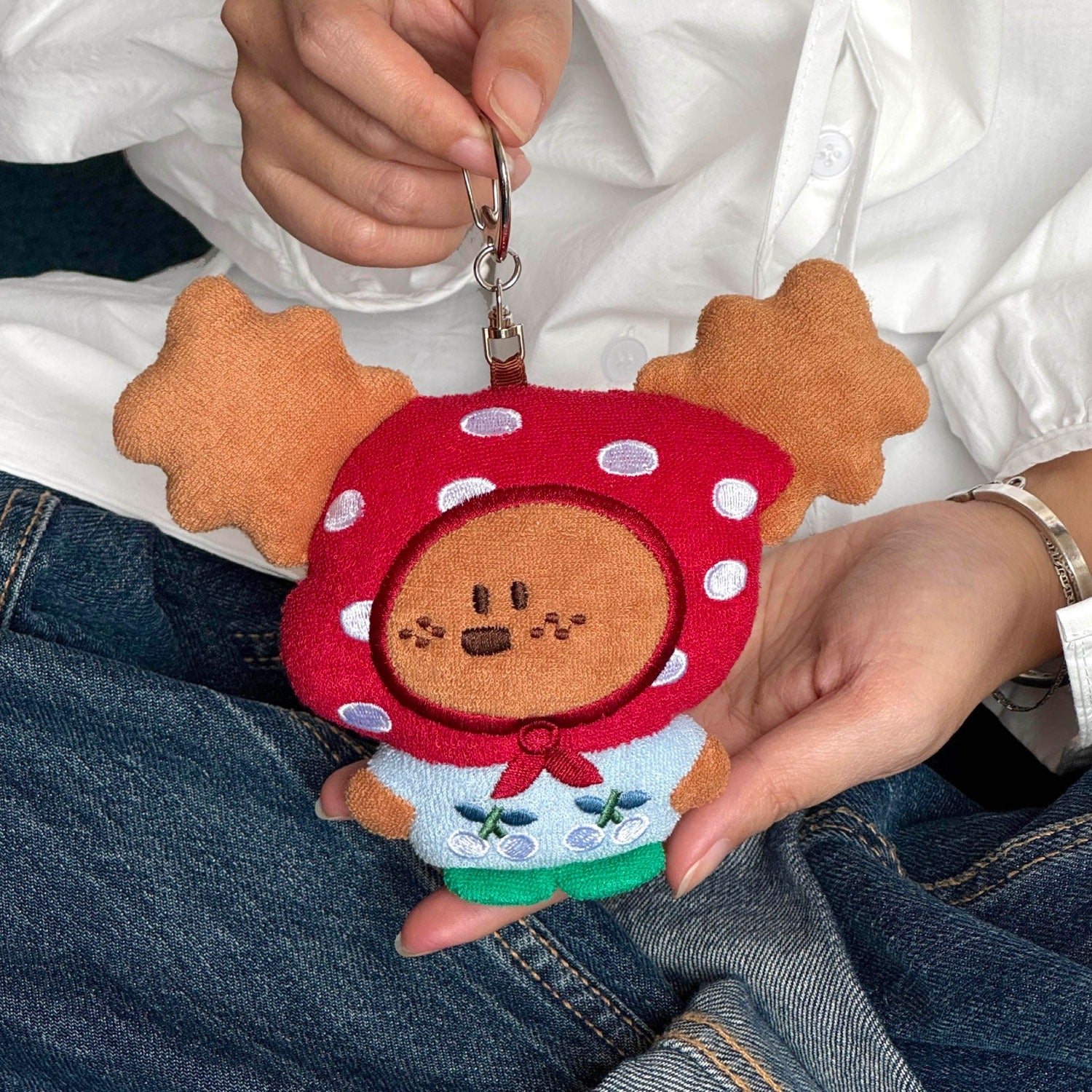With her charming embroidered freckles and fuzzy antler-shaped ears, this plushie brings the perfect blend of "cottagecore" and "kawaii" aesthetics. She is the perfect size to tag along on your adventures—simply clip her onto your backpack, purse, tote bag, or keys using the sturdy metal lobster clasp.