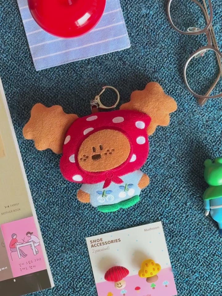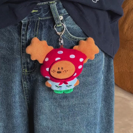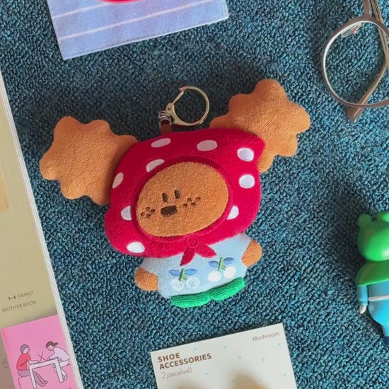 Add a touch of whimsy to your daily carry with this adorable Freckles Puppy Plush Charm! This ultra-cute companion is dressed to impress in a woodland-inspired outfit, featuring a vibrant red mushroom cap hood and a sweet baby blue shirt embroidered with cherries.