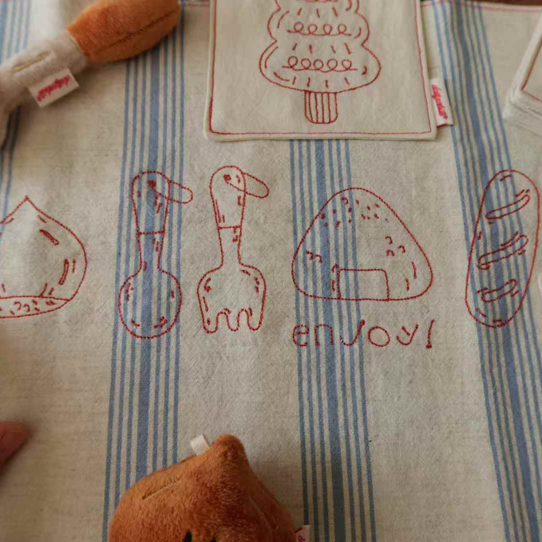 Bring a touch of whimsical charm to your kitchen with the Daily White "Enjoy!" Collection. This beautifully crafted tea towel features hand-drawn style red embroidery on a classic blue-striped cream linen base. Each piece is designed to celebrate the simple joy of a good meal, featuring adorable anthropomorphic food characters and utensils.