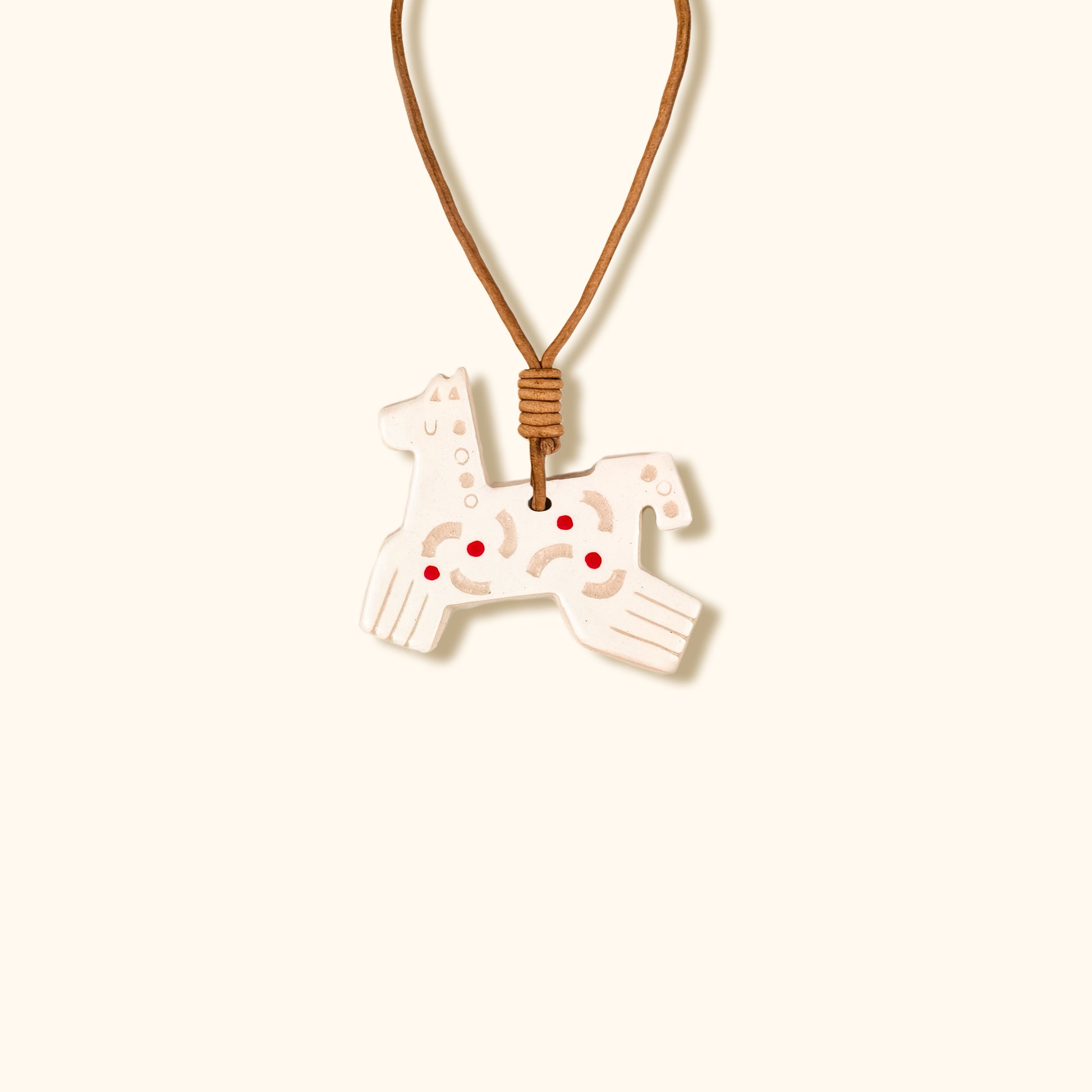 Crafted from quality ceramic and finished with an earthy, off-white speckled glaze, this stylized horse features striking red and black details that give it undeniable character. Suspended from a soft brown leather cord and secured with an artful decorative knot, this charm is as versatile as it is beautiful.
