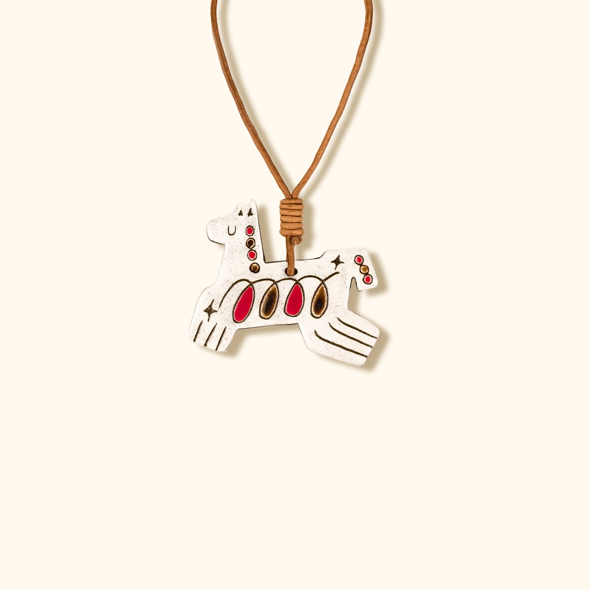 Crafted from quality ceramic and finished with an earthy, off-white speckled glaze, this stylized horse features striking red and black details that give it undeniable character. Suspended from a soft brown leather cord and secured with an artful decorative knot, this charm is as versatile as it is beautiful.